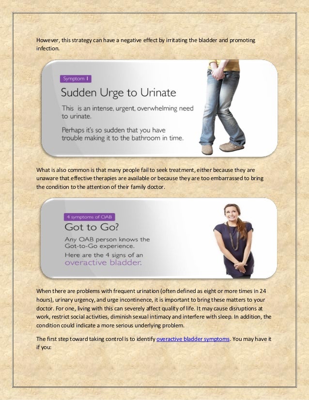 This can lead to troubling urinary some conditions—such as urinary tract infection, early pregnancy, uncontrolled diabetes mellitus, prostate disease and bladder tumors—have symptoms. Why does it happen and what can be done about it? An overactive bladder, better known as incontinence, is experienced by 1 in 4 women. If you are pregnant, talk to your doctor about the potential for bladder damage if you have a vaginal delivery.