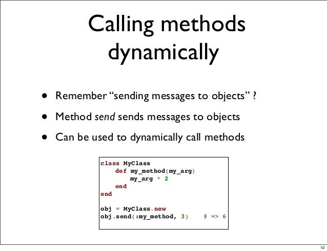 View Ruby Call Vs Send UK. I love ruby's syntax for method calls. Ruby, specially as being a dynamic language, you can create methods on the fly, add instance variables, define constants and invoke existing methods dynamically.
